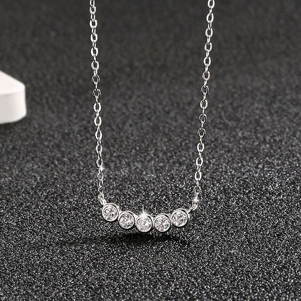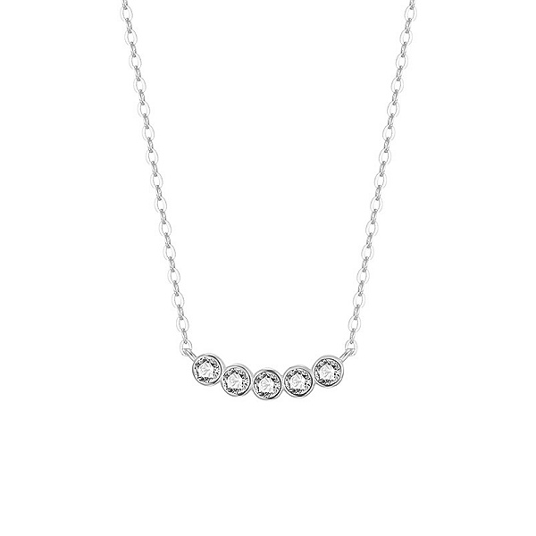 Luxusní dámský stříbrný náhrdelník s pěti pevně spojenými kulatými zirkony zaujme svým jednoduchým, ale elegantním designem. Vyroben ze stříbra ryzosti 925/1000, je vhodný pro citlivou pokožku a díky rhodiované povrchové úpravě si zachovává svůj lesk. Perfektní volba jako stylový dárek pro ženu, která miluje jemné a decentní šperky. Délka náhrdelníku je 40+5cm prodlužovací řetízek. Zirkony o průměru 3mm, vsazené do obrub, tvoří ozdobnou část a její celková délka je 15,5mm. Dodáváno v naší originální krabičce. Náhrdelníček je pokoven rhodiem, které dodává výrobku vzhled luxusního zboží podobný bílému zlatu a zároveň chrání stříbro před jeho přirozenou oxidací (tzv.zčernání).
