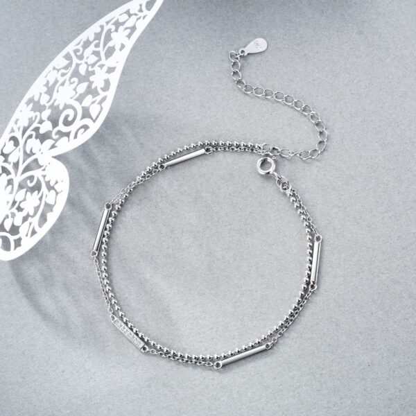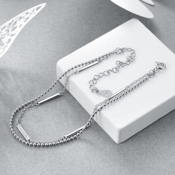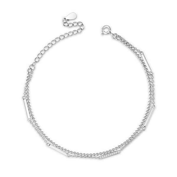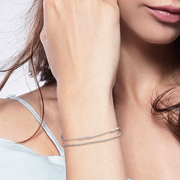 Stříbrný náramek na ruku 925/1000. Náramek se skládá ze dvou řetízků a jedné destičky se zirkony. Jeden řetízek je kuličkový a druhý ankr s pěti destičkami z nichž jedna je osazena zirkonky. Velice moderní, jemný a elegantní náramek. Velikost 17 cm + prodlužovací řetízek 5 cm. Zapínání na pérový kroužek. Rhodium dodává výrobku vzhled luxusního zboží podobný bílému zlatu a zároveň chrání stříbro před jeho přirozenou oxidací (tzv.zčernání).