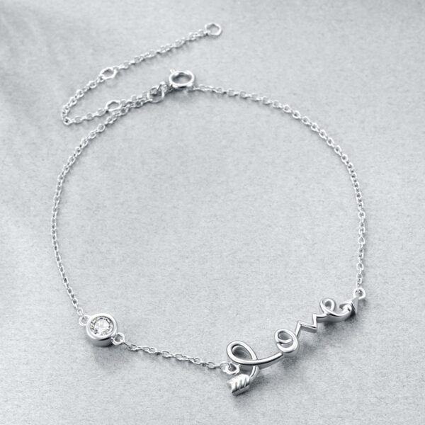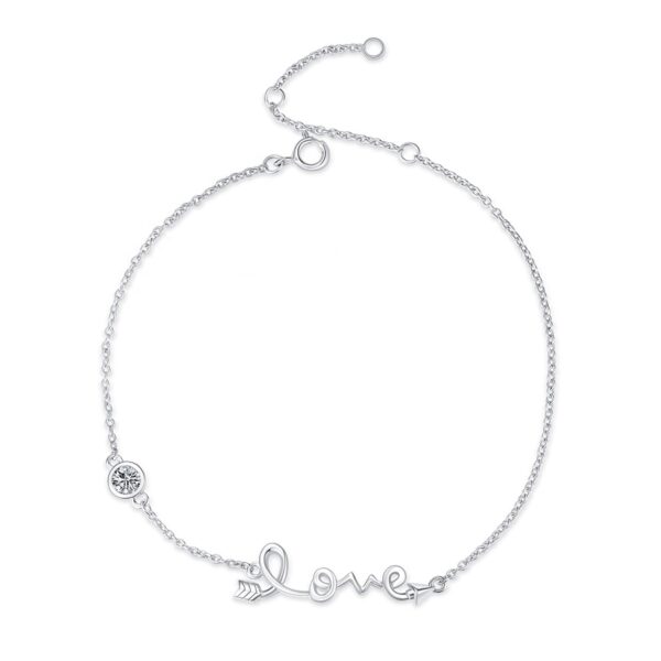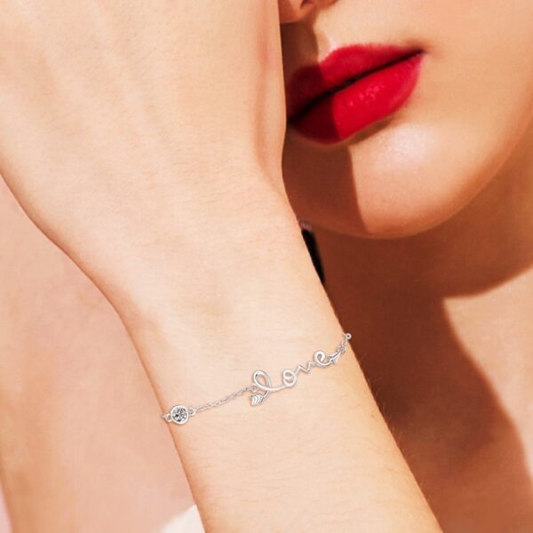 Stříbrný náramek na ruku 925/1000 s nápisem LOVE a čirým zirkonem. Velice moderní, jemný a elegantní náramek. Rozměr nápisu š.25mm v.8mm, celková velikost 17 cm + prodlužovací řetízek 5 cm. Zapínání na karabinku. Rhodium dodává výrobku vzhled luxusního zboží podobný bílému zlatu a zároveň chrání stříbro před jeho přirozenou oxidací (tzv.zčernání).